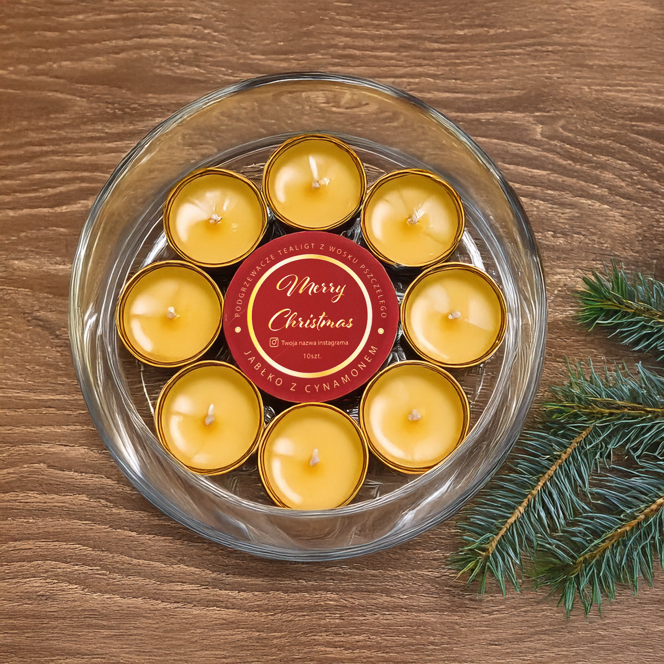 Oferujemy elegancką, świąteczną etykietę stworzoną z myślą o podgrzewaczach tealights z naturalnych wosków.