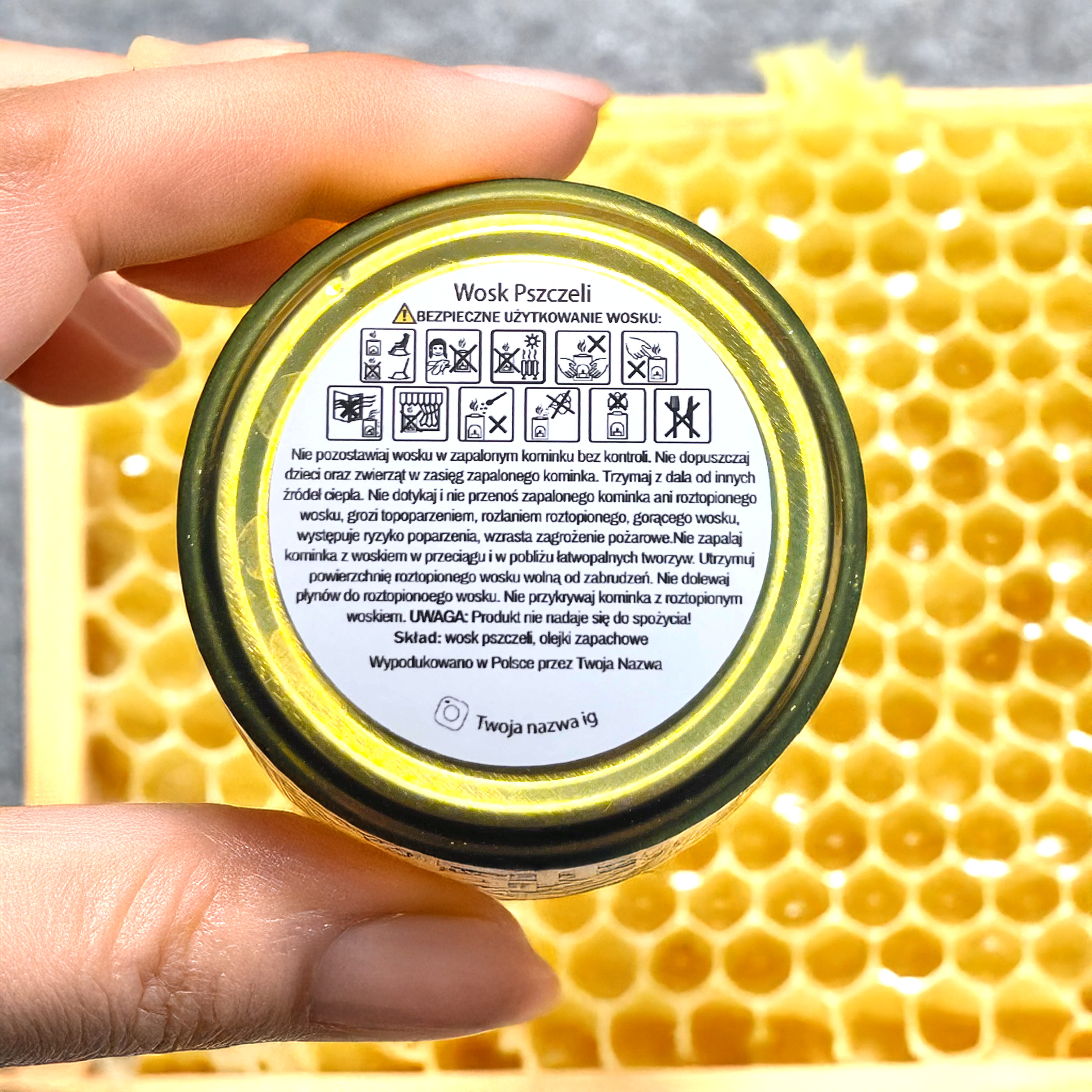 Naklejka idealna do oznaczenia ręcznie robionych wosków pszczelich, zapachowych. Minimalistyczny design, czytelne oznaczenia i elegancki wygląd zapewniają profesjonalny charakter oraz łatwe zrozumienie zasad bezpiecznego użytkowania.